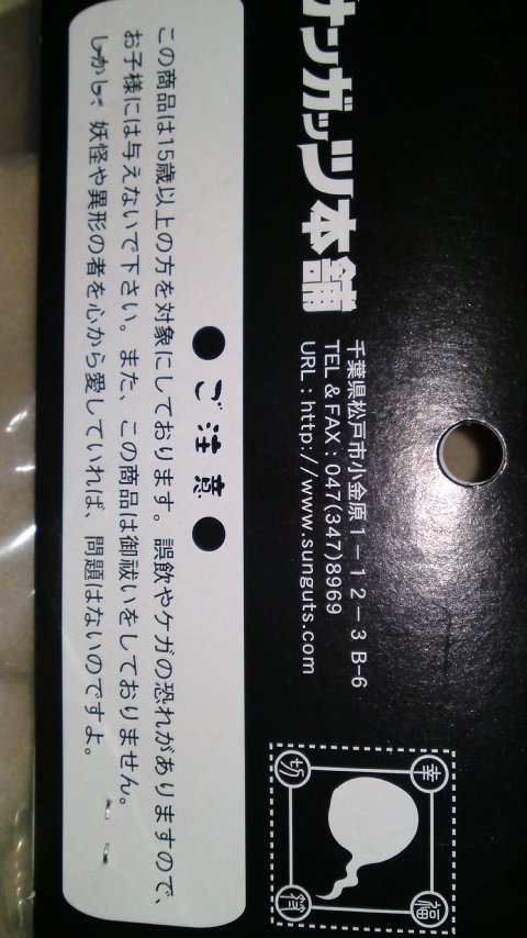 「この商品は15歳以上の方を対象としております。誤飲やケガの恐れがありますので、お子様には与えないで下さい。また、この商品は御祓いをしておりません。 しかし、妖怪や異形の者を心から愛していれば、問題はにのですよ。」(以上、引用)